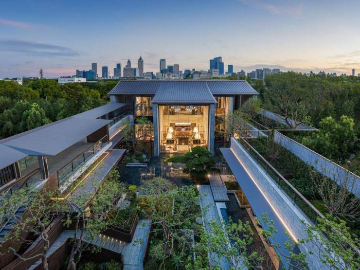 临水而建的合院产品,以横向披檐和现代极简线条演绎东方院落精神,大面积玻璃与层层退台的设计,让室内外空间与湖景充分互动。