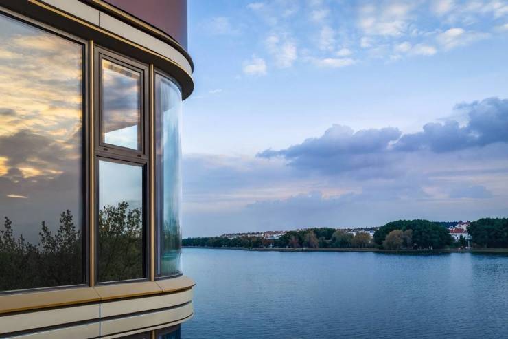 城央望湖平层采用通透玻璃幕墙与转角无柱设计,实现约270度开阔湖景视野。抱湖洋房则以水平舒展的精致檐口勾勒轮廓,南北通透的玻璃立面如巨大曲面屏,与湖光相映成趣。